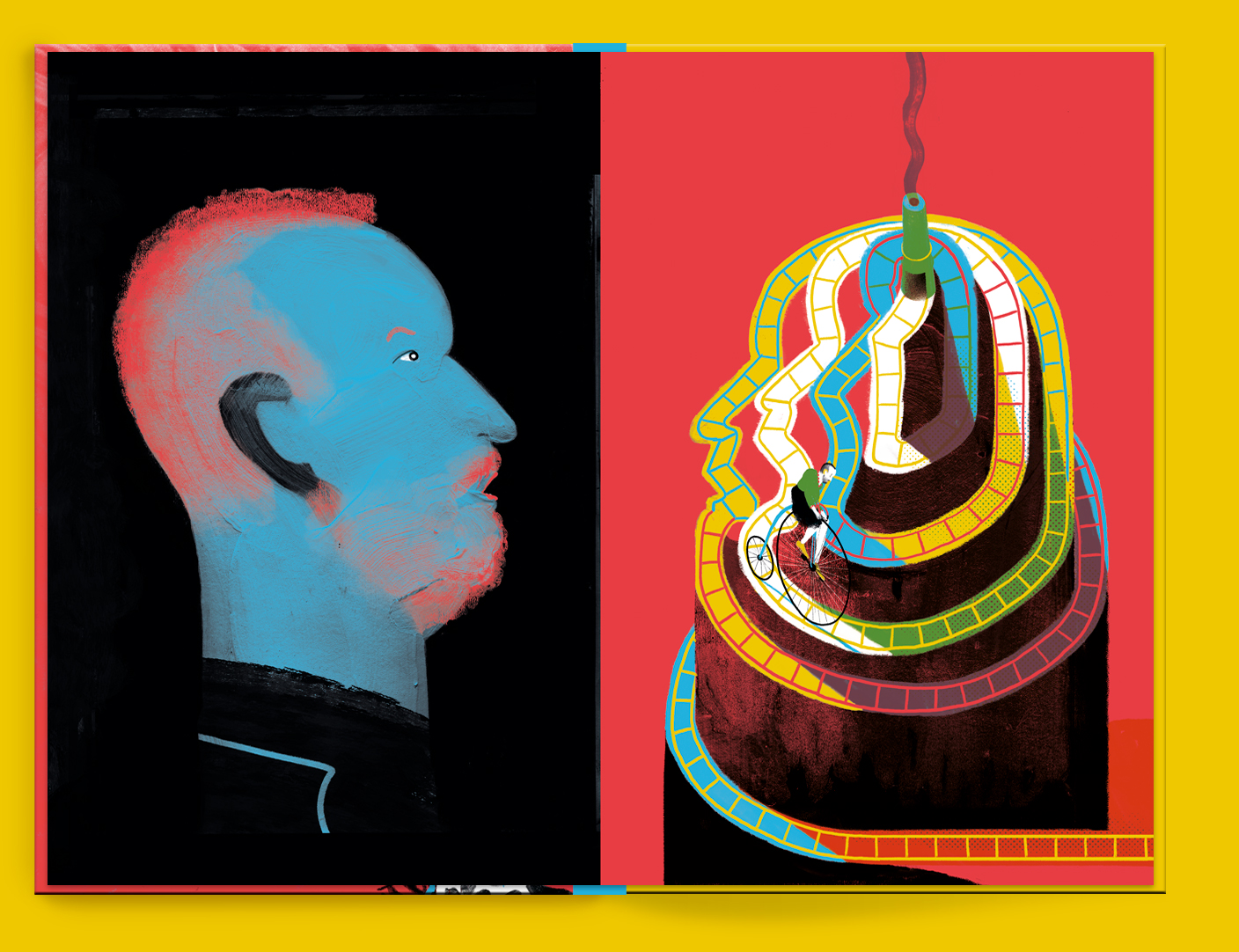 When a yellow bicycle and a blue bicycle cross in a corner