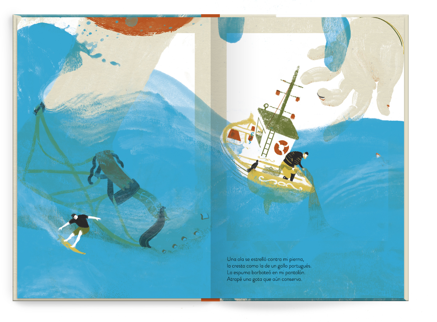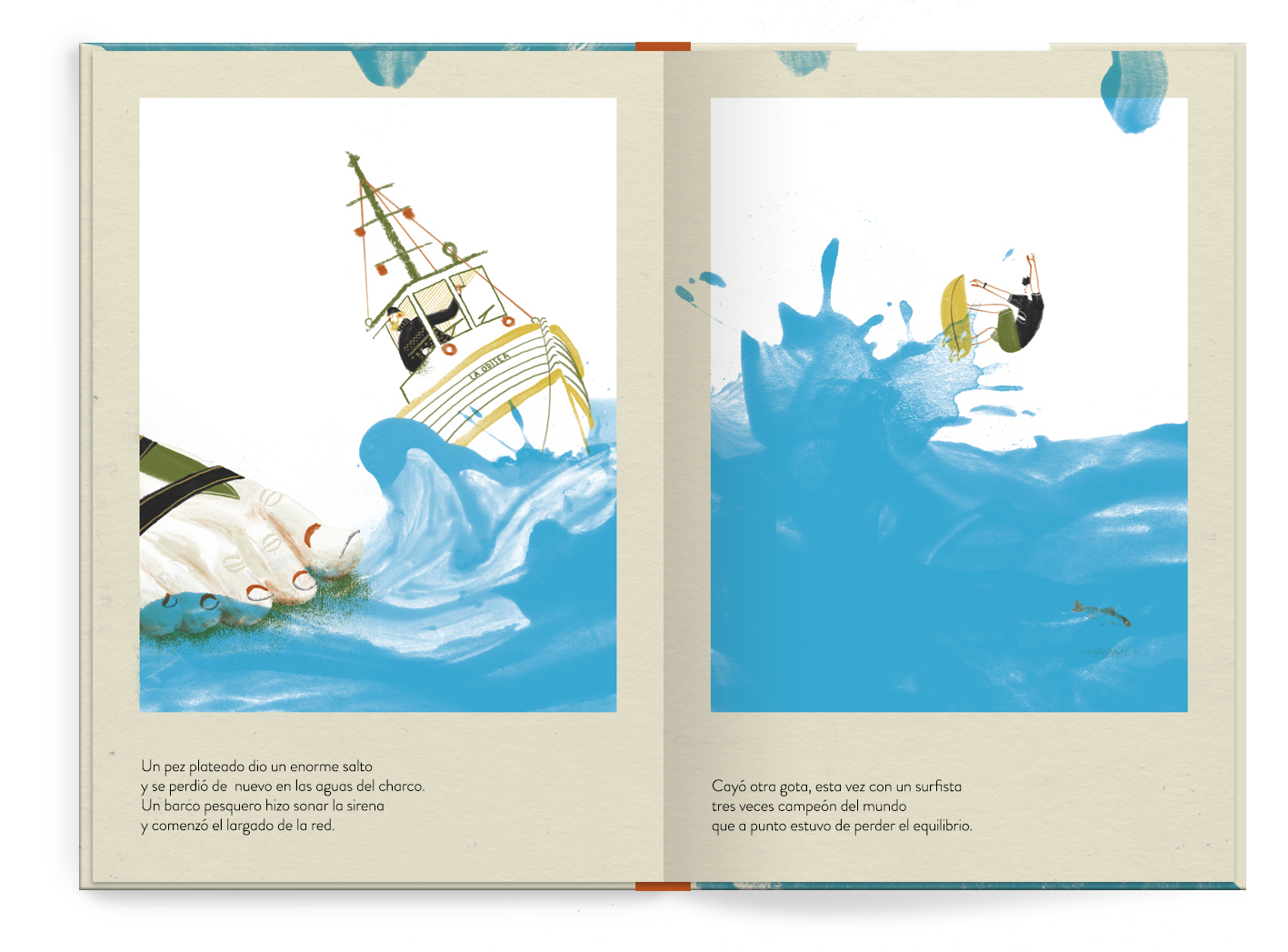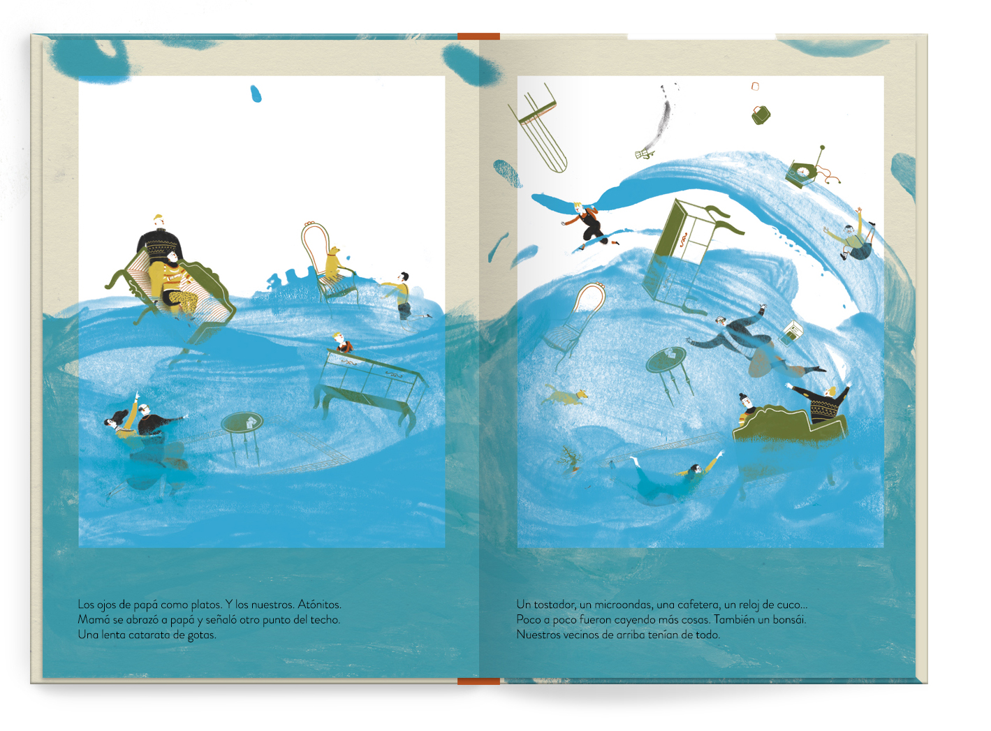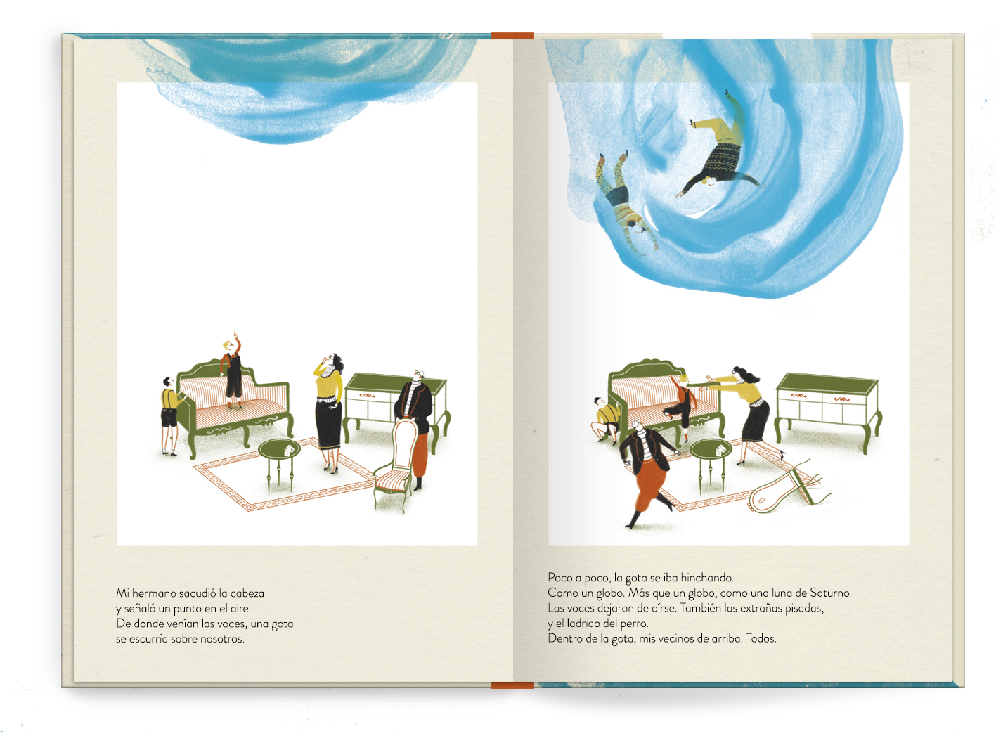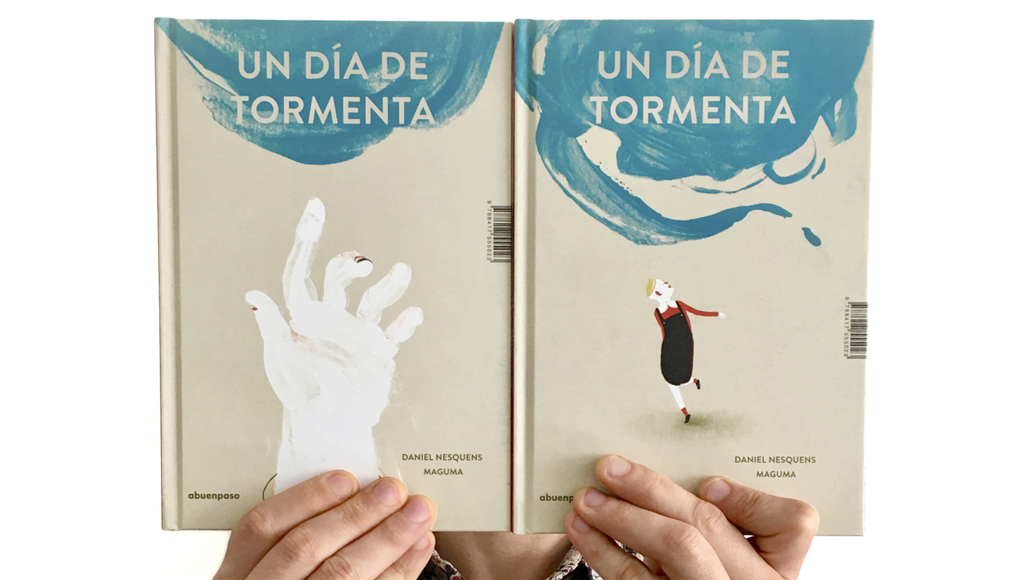 Rain water only enters the neighbors building. At the same time two people greet each other under an overcast sky.Two covers. Two stories that come together in one picture book. A stormy day